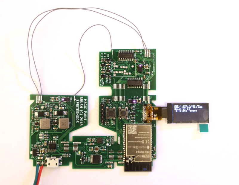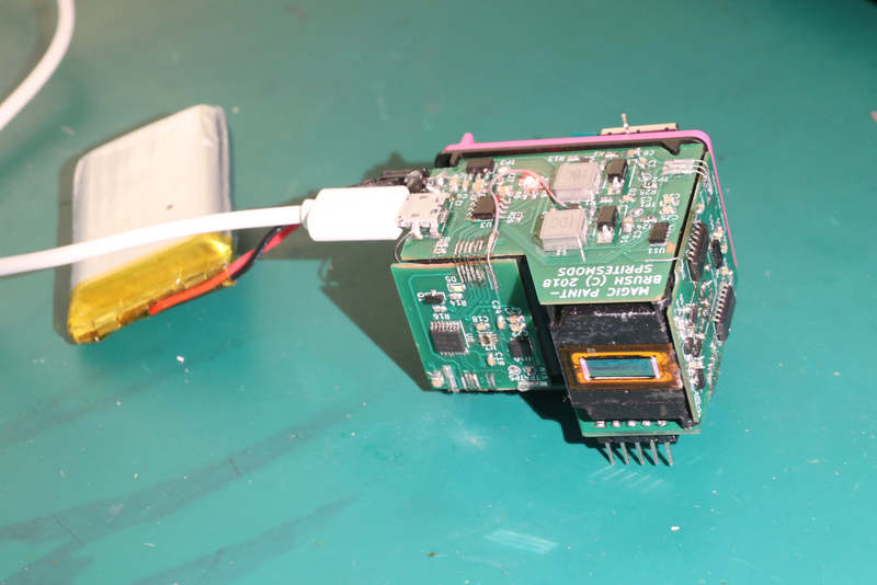 Ofcourse, some level converters and mosfets don't make a viable printer cartridge controller all by itself. That is why I made a standalone device, intended as a platform to play around with the printer cartridge and everything it can do. It has an ESP32 module, the needed logic to control the printer cartridge, as well as some power supplies to run from a LiIon cell. It's also equipped with some sensors, meant to try to compensate for the not entirely ideal movement human arms tend to make, as well as some buttons and a display to give some feedback to what's going to get printed. Let's walk through the components, if any to perhaps give some inspiration for any printer cart hacking anyone else wants to do: