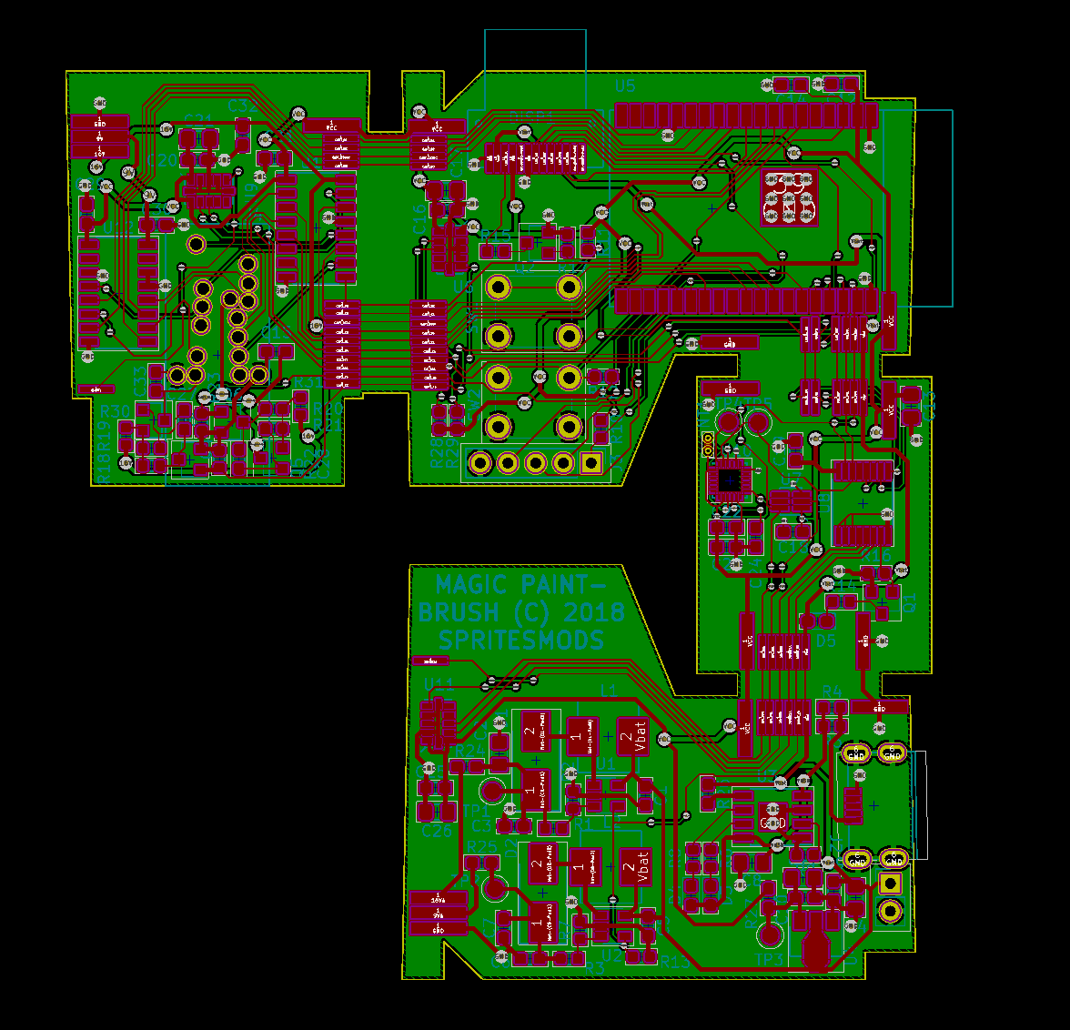 This is the PCB I designed from the schematic. It is in a weird shape as it is meant to be split up in four separate PCBs that 'fold around' the printer cartridge. They're electrically and physically hooked up; one of the advantages is that this way, the board house doesn't see it as four separate PCBs and only bills you for one.