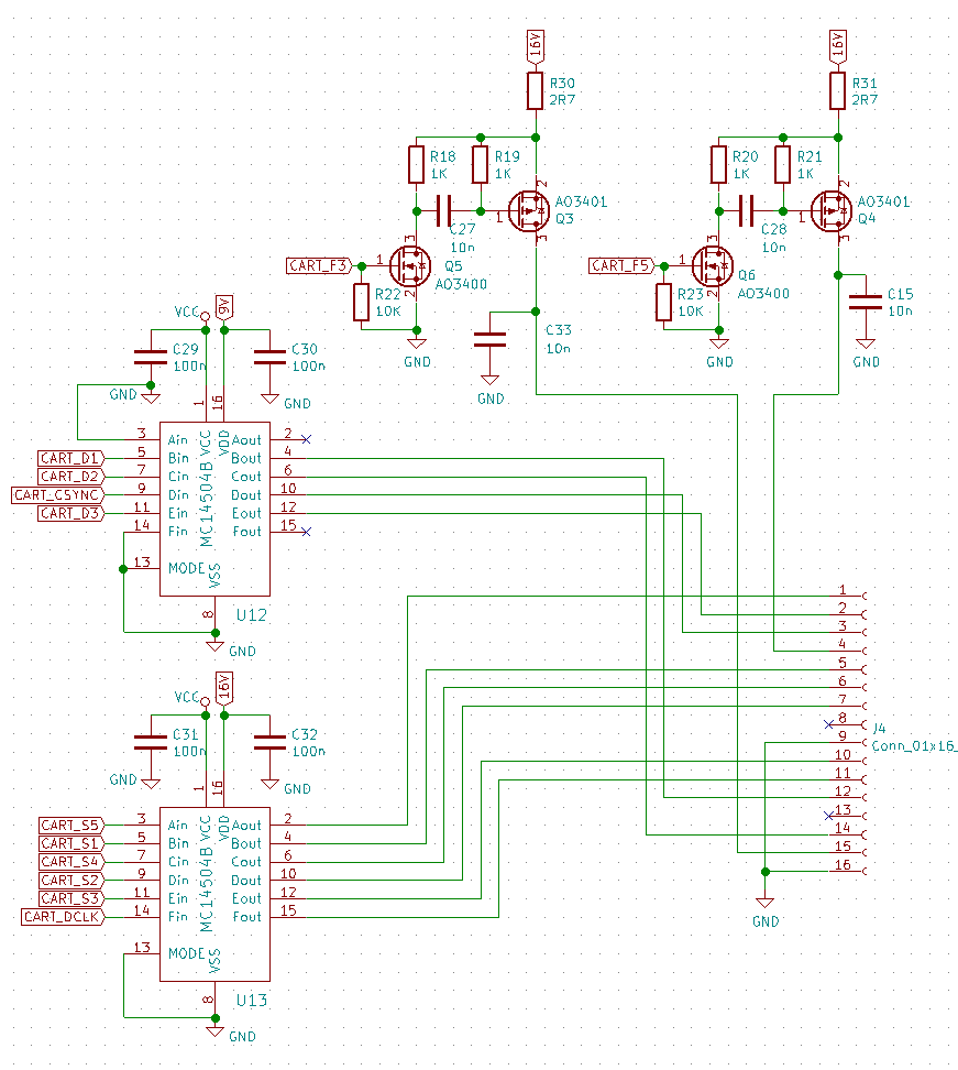 This is the cart interface. As discussed before, it's not exactly complicated. All signals can be neatly level-converted by a pair of MC14504 ICs, one for the 9V and one for the 16V signals. Also visible is the two-mosfet-based level shifter / safety circuit that controls the dual power lines.