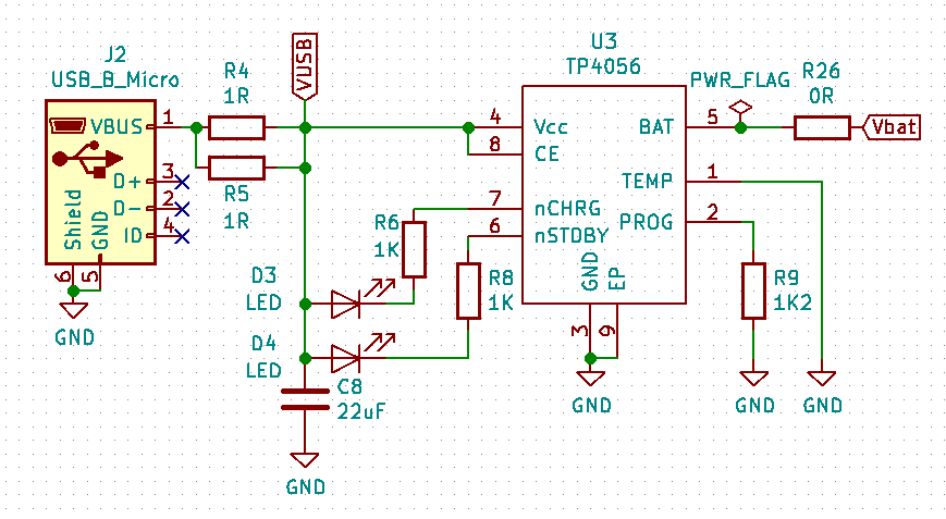 As the entire thing is powered from a LiIon cell, there needed to be a way to charge it as well. I had some space left, so I added a simple TP4056-based LiIon charger that can recharge the battery from any USB power source.