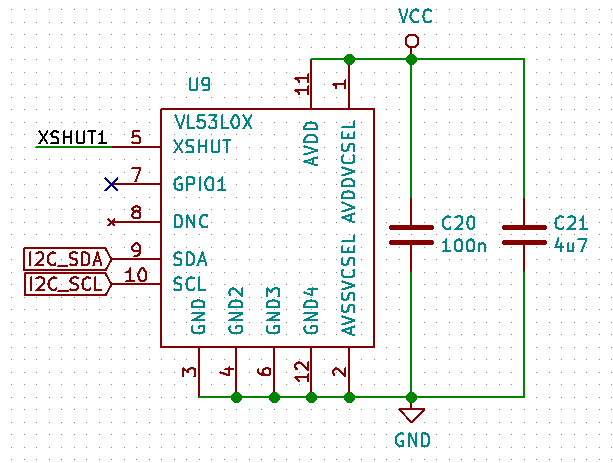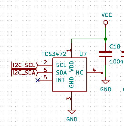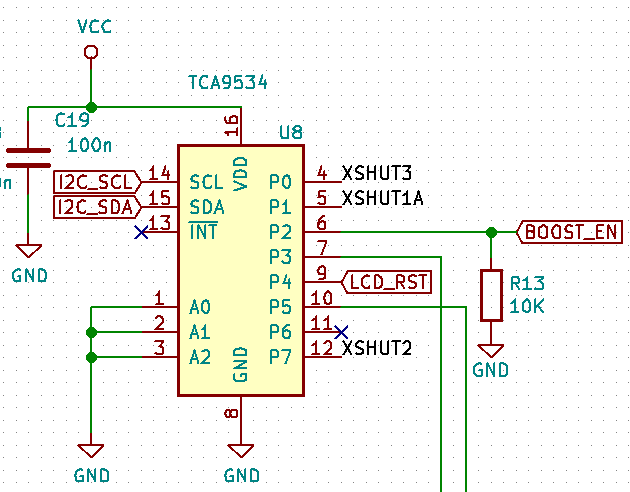 Because I also needed some extra GPIOs, I connected a GPIO expander to the bus as well. It controls the reset lines for the three ToF distance sensors, the reset line for the LCD, the enable for the boost converter and (not shown) two mosfets that control the white LED used to illuminate the target for the color sensor and the backlight for the LCD. The ToF sensors need a separate reset line because they power up at the exact same I2C-address. However, they do have a command to change that I2C-address after power-up. By powering them up and moving them to a different I2C-address one by one, I'm still able to control all three over a single I2C-bus.