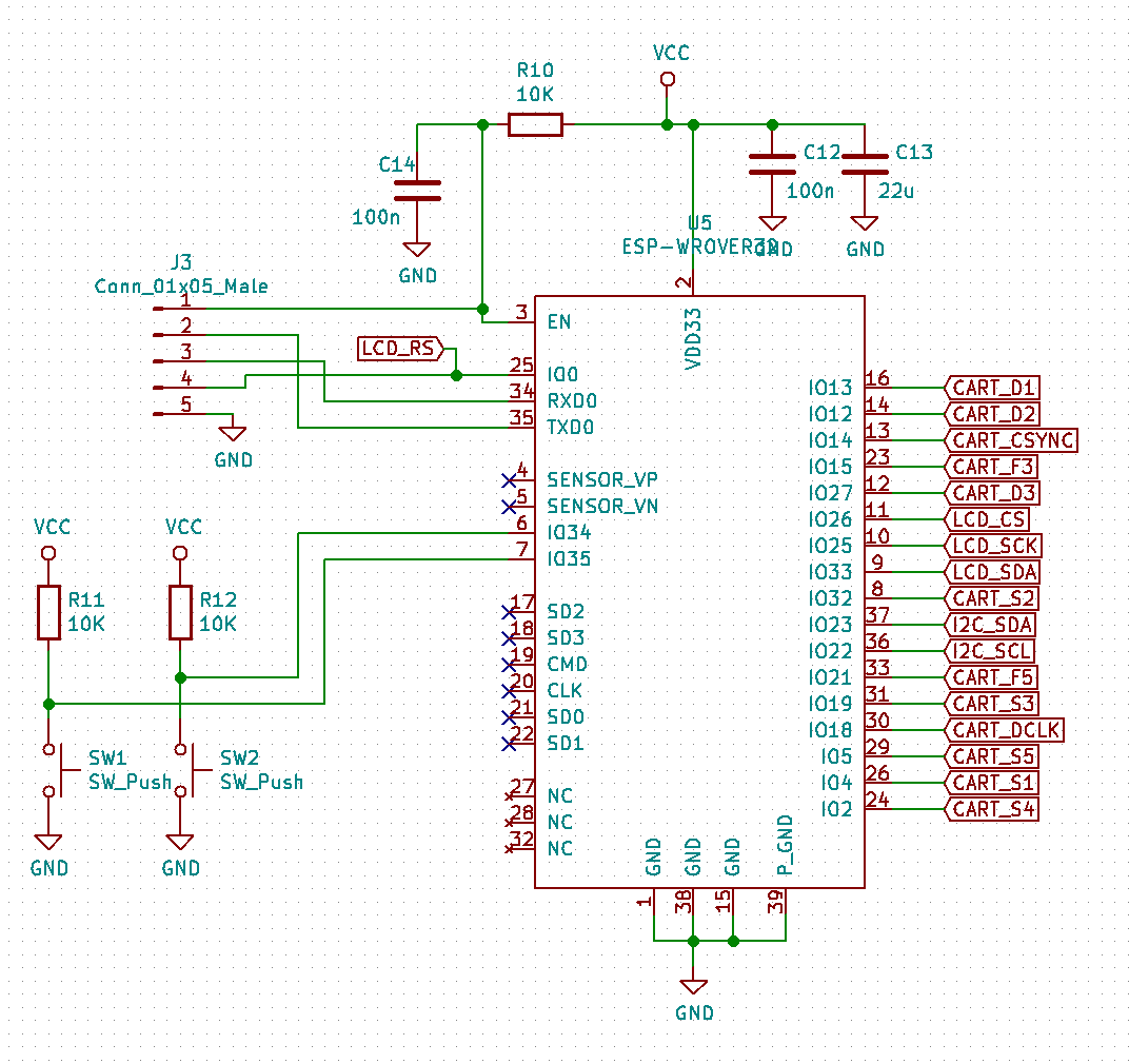 The intelligence of the device is provided by an ESP-Wrover32 module. The specific variant I used has 8MiB of flash and 8MiB of SPI RAM in it; enough to do some fancy image processing if I feel the need to do that. There's also a 5-pin connector that allows me to program and debug the firmware on the module, as well as two buttons that can be used to select options and start drawing when the firmware is running.