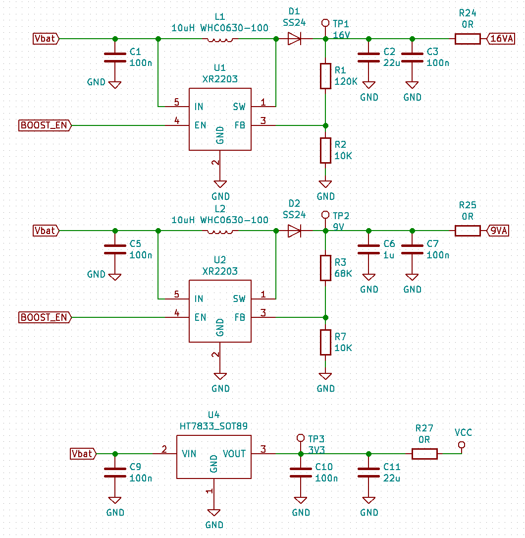 Let's start with the power supply. Power comes in from a LiIon cell and gets converted to 3.3V, 16V and 9V. The 3.3V is needed for the sensors and the ESP32; it is generated using a simple HT7833 LDO. The 9V and 16V are generated by two boost converters built around the XR2203 boost converter chip. Note that the 16V power supply needs to work way harder than the 9V power supply; the cartridge only sips a few milli-amps of 9V power. The reason the two boost converters are dimensioned the same is purely so I only had to buy one type of components for both.