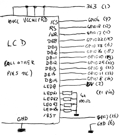 As you can see, there's not much to it. Most IO-pins are directly connected. To save some I/O, the /rd-pin is permanently tied to Vcc because it's not necessary to read from the display. There are 4 resistors for the backlight, and that is it. The pin numbers for the LCD seem to differ from datasheet to datasheet, by the way: if the data pin numbers on your LCD go up to DB17, you'll need to connect the GPIO to DB10-17 instead of DB8-15. Notice the touchscreen isn't connected: it wouldn't have much use on a mini arcade case, and would require extra hardware to get working because the RPi doesn't have integrated AD-converters. I later actually removed the touchscreen from the display to get a clearer image.
