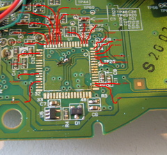If you want to know the connections, I've made a note of them. Aside from these connections, all you need is an 20MHz crystal connected to the correct pins of the ATMega88. The final thing missing now is a small correction on the PCB of the Xbox-controller: while the resistors etc that were in place for the ST chip will work for the AVR too, the ST was a high-speed device while the AVR is a low-speed one. That means the 1.5K pullup needs to be moved from the USB D+-line to the USB D--line. See the image for how to archieve that: the 1.5K-resistor was above C6 and is moved to between the yellow wire and the black unit next to R4.